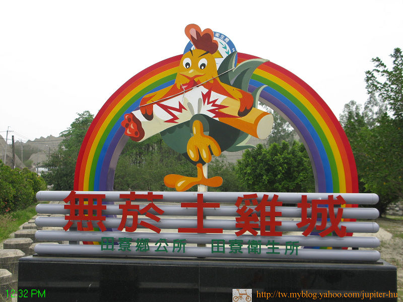 離開崇德社區,接回台28線,惡地形就到處可見。Jupiter看到一塊彩虹招牌,上面寫著「無菸土雞城」,原來是田寮鄉26家土雞業者,於去年 (2009年)年底共推無菸、無檳榔的餐飲環境,拒絕煙害。這是村民自覺的運動,值得讚許。![]()