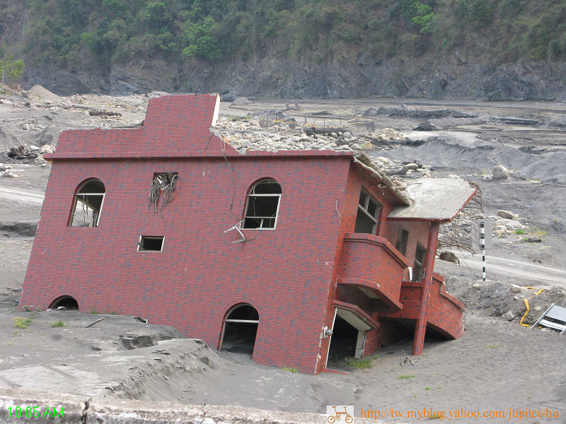 更令人觸目驚心的是一幢暗紅色透天樓房,以45度傾倒在河床上,一樓還沈在泥沙裡...