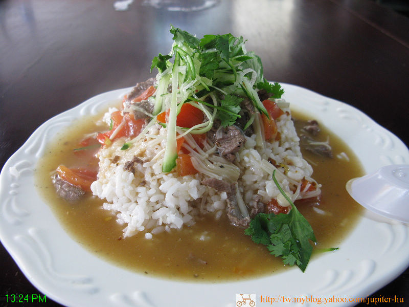 午餐在一家餐廳吃,剛好有從台南來的「平地人」推薦這家的葱香炒牛肉,Jupiter就點一盤牛肉繪飯,還不錯啦~ Jupiter原以為多納溫泉消失了,這裡就沒提供吃的哩,感溫哪~