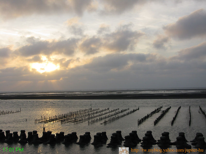 。Jupiter/YSL騎著Birdy「柑仔」和 Birdy「Molly」前往鄰近的[箔仔寮漁港],沿著海堤上,看著夕陽下的蚵田,一根根蚵柱串起一堆蚵仔。台電的巨大風車,橫在防風林中...▲蚵田夕照