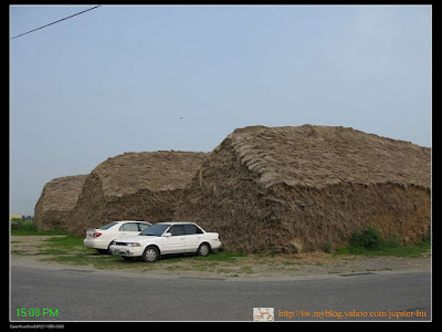 --用怪手、卡車堆成大型草堆。原來這是農民收割稻作後,剩餘的稻草是他們的寶貝,因為稻草可燒成綠肥,成為下一期稻作的天然肥料;此外還可以輔助房屋的補建、農作物的防寒材料。