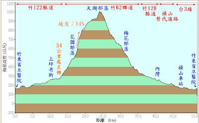 > (櫻花林) > 天湖部落 (最高點) > 梅花部落 > 內灣 > 台3線 >