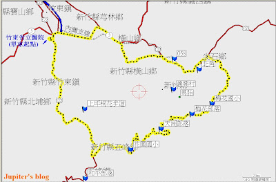 ▲今日地圖。從竹東醫院出發,往五峰,過坪林老街後,左轉進入花園部落,越過天湖部落,來到內灣,再回到原點